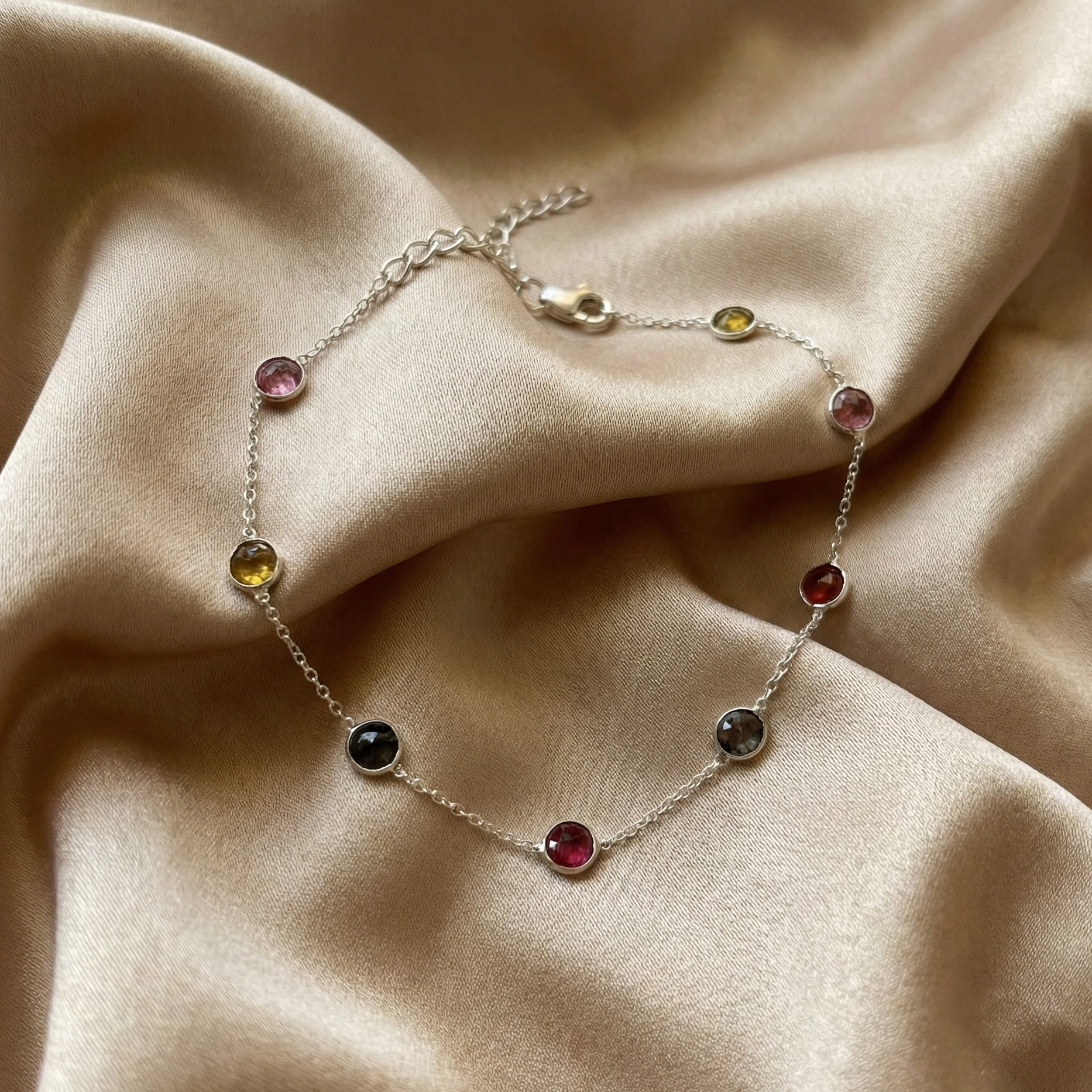 Handcrafted from premium 925 Sterling Silver, this delicate chain features a spectrum of genuine Tourmaline gemstones. From deep berry pinks to earthy moss greens and golden ambers, each stone is bezel-set to catch the light from every angle. It’s the kind of effortless accessory that looks just as good with a cocktail dress as it does with your favorite jeans.